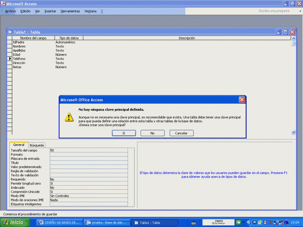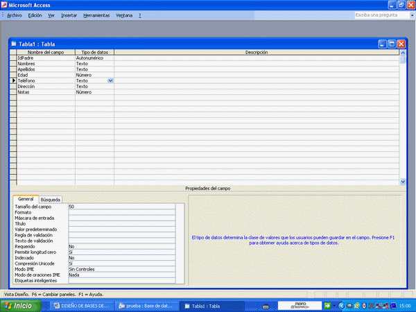 Si se dio cuenta en la parte de debajo de la tabla aparecen otras informaciones importantes. La primera de todas es la que nos interesa. Se trata del tamaño del campo. Por defecto access le pone 50 de longitud, pero nosotros debemos manipularlo a nuestra voluntad dependiendo del tipo de campo, por ejemplo, el campo "Dirección", deberíamos ponerle una longitud mayor de 50. Para los campos nombres y apellidos está bien 50, pero para teléfono con 20 o 15 es suficiente. El campo de Edad lo hemos puesto numérico, pues se usará número en ese campo.