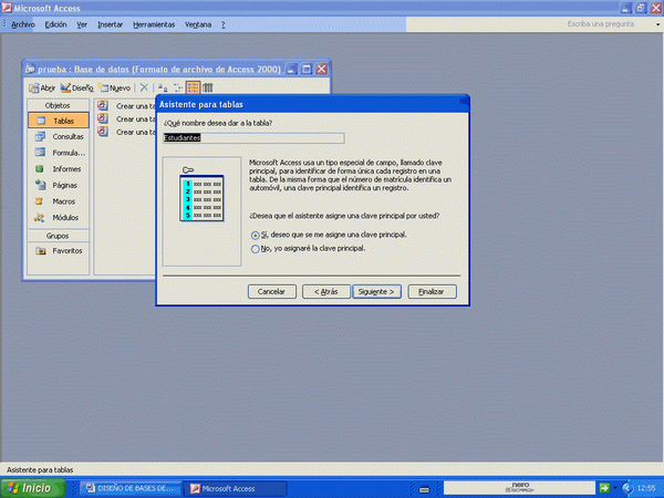 Me pide el nombre que deseo ponerle a la tabla. Por defecto el sistema le pone el que escogimos de la primera opción de la izquierda. En este caso "Estudiante". Abajo me pregunta si deseo que el sistema le asigne una clave principal o si no. Esto es un campo numérico como clave principal. La clave principal se usa cuando quiero relacionar varias tablas, entonces usamos ese campo como enlace. Pero eso lo veremos más adelante.