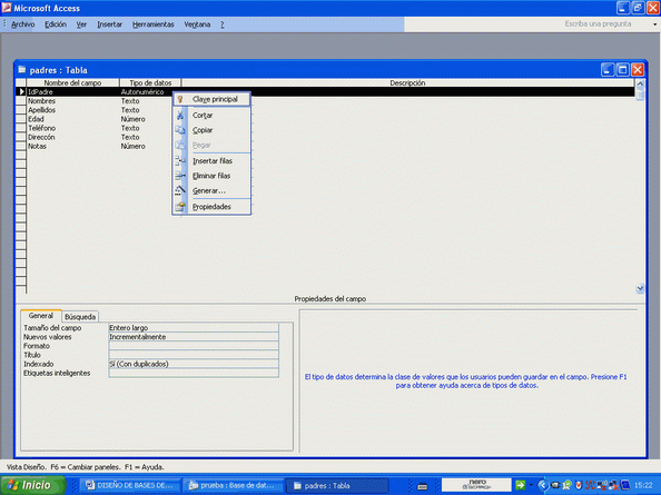 Si se fijan bien arriba de los objeto hay un menú que dice "Abrir", "Diseño" y "Nuevo". Cuando seleccionan una tabla automáticamente se activa este menú.Marque con un clic la tabla "padres" y luego presione "Diseño" y se volverá a abrir la tabla. Marque el campo "IdPadre", déle un clic derecho y aparecerá la opción para poner la clave principal.