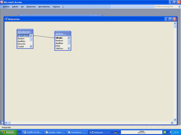 Le da clic y ya está. IdPadre es la clave principal de la tabla "padres", así como "IdEstudiantes" es la clave principal de la tabla "Estudiantes". Ahora ya podemos relacionarla. Pero qué es relación entre tablas? Se relacionan tablas por que tienen datos comunes. Hay relación de uno a varios. Un campo de una tabla se relaciona con varios de otra. Y hay relaciones de varios a varios, como de uno a uno. En nuestro caso haremos una relación de uno a uno. Esto quiere decir que un estudiante tiene o guarda relación con uno o dos de los padres que se colocarán en la tabla "padres". En vez de hacer una sola tabla con todos los datos, hicimos dos con los datos por separados de esa manera se manejan mejor los datos. Busque en laInternet más información sobre tablas relacionales. Vamos a hacer la relación.