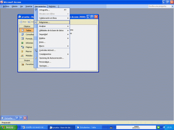 Como ilustra la figura, nos vamos a HERRAMIENTAS / RELACIONESဦLe damos clic y veremos la pantalla siguiente: