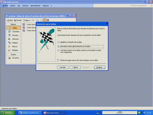 Con esto termina la creación de la tabla, pero tengo ahora tres opciones: modificar el diseño, introducir datos o introducir datos usando un formulario creado por el asistente. Déle a finalizar con la segunda opción para entrar algunos datos.