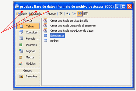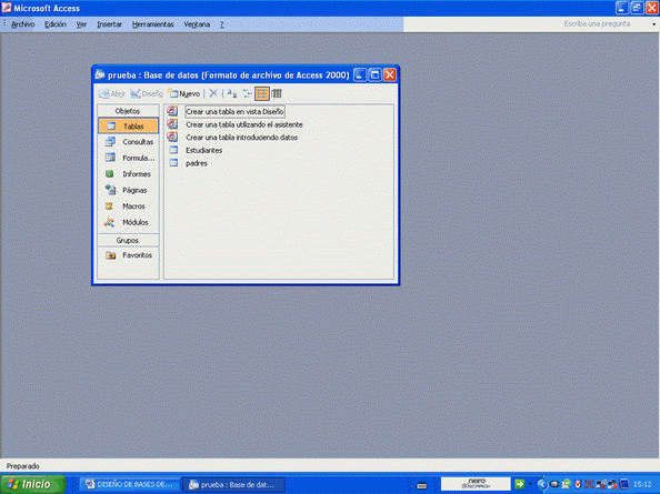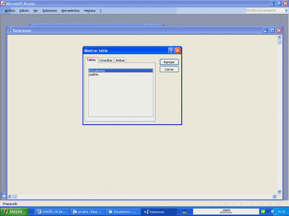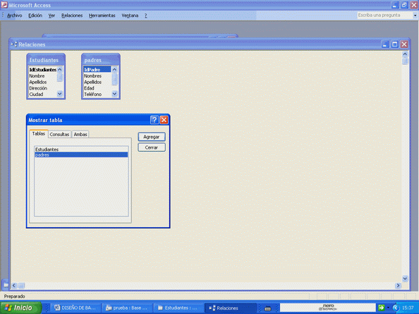 Responda que NO ya que lo haremos de otra forma más didáctica. Cierre y vuelve a aparecer la estructura de la base con sus dos tablas: Estudiantes y padres.
