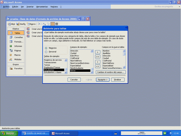 A la izquierda sale un conjunto de diversos temas y en el centro los campos de cada tema y a la derecha dos botones para agregar los campos en el cuadro en blanco. Escoge el tipo de base que desees, los campos que quiera y luego déle a siguiente. Sigue el asistente y en cuestión de minutos habrás diseñado una base completa. Escojamos estudiante de las opciones de la izquierda y veamos las distintas pantallas: