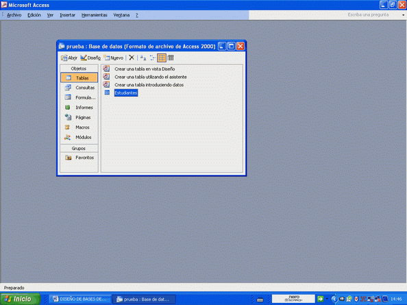 Esta opción de las tres que nos presenta el sistema al principio es más compleja, pero nos permite aprender bien la estructura de la tabla. Cierre Access y abra la base recien creada de nuevo. Veremos algo así:Los distintos objetos a la derecha y nuestra tabla hacia el centro. Ahora vamos a hacer otra tabla con los datos de los padres de los estudiantes (de la tabla "Estudiantes" que hemos creado con el asistente) y vamos luego a relacionar ambas tablas por la clave principal. Escojamos ahora la primera opción, "Crear una tabla en vista diseño". Déle clic y sale lo siguiente: