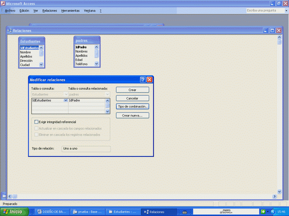 He añadido las dos tablas. Fíjese que en ambas tablas los campos claves están en negrita. Cierro la ventana anterior y dando un clic sobre "IdEstudiantes" lo arrastro sobre "IdPadres" y lo suelto, pero me aparece otra ventana en donde se me permite ver los campos a relacionarse y la opción a cambiar a otros campos. En el botoncito emergente de cada campo relacionado, si le das ahí, saldrán todos los campos de la tabla y si quieres cambiar la relaciónဦ